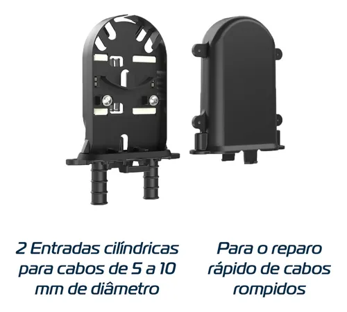 Possui duas entradas cilíndricas para cabos de 5 a 10 mm, com vedação feita por tubos termocontráteis (SVT). O fechamento entre cúpula e base ocorre de forma segura por trava mecânica tipo click, garantindo fácil manuseio e proteção IP65